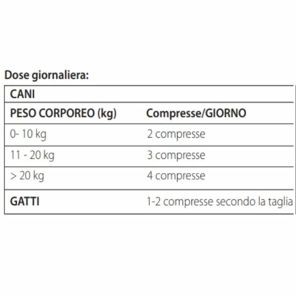 Impiego: Somministrare per almeno 20 giorni consecutivi. Le compresse possono essere somministrate direttamente all’animale o aggiunte al cibo. È consigliabile suddividere la dose giornaliera in 2 volte, preferibilmente durante i pasti.