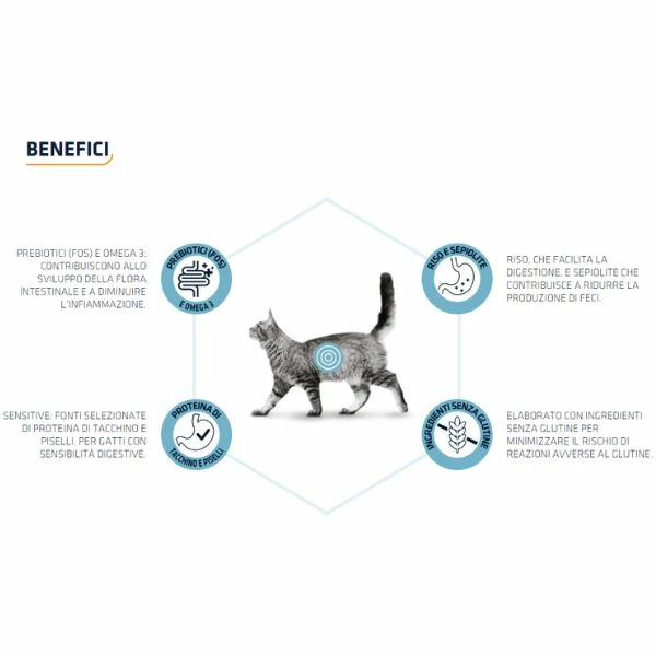 – sensitive: fonti selezionate di proteina di tacchino e piselli, per gatti con sensibilità digestive