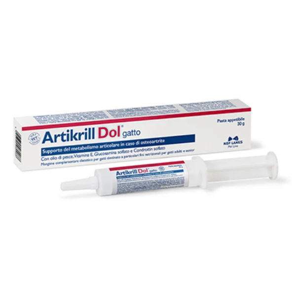 Artikrill Dol Pasta Gatto è un mangime complementare dietetico per gatti destinato a particolari fini nutrizionali per gatti adulti e senior, con Olio di pesce, Vitamina E, Glucosamina solfato e Condroitin solfato. Indicato a supporto del metabolismo articolare in caso di osteartrite.