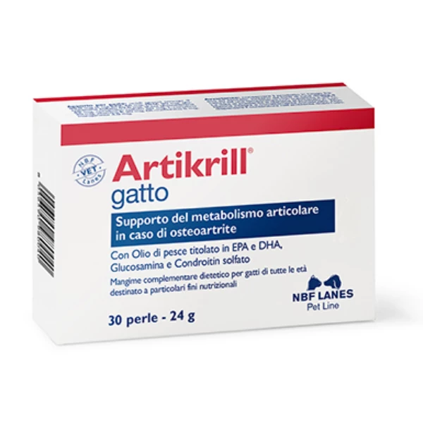 Artikrill gatto di NBF Lanes è un mangime complementare dietetico per gatti di tutte le età destinato a a particolari fini nutrizionali con olio di pesce titolato in EPA e DHA, Glucosamina e Condroitin solfato. Funge da ottimo supporto del metabolismo articolare in caso di osteoartrite.