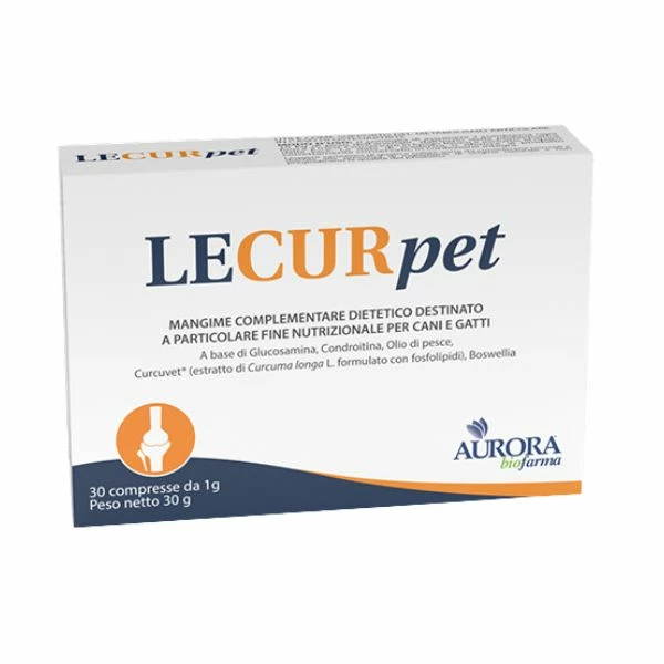 Aurora Biofarma Lecurpet Compresse cane e gatto è un alimento complementare utile come supporto al fisiologico metabolismo articolare. Disponibile nella confezione da 30 compresse da 1 gr.