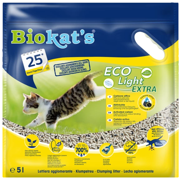 Biokat’s EcoLight Extra è una lettiera vegetale per gatti, composta da materie prime vegetali rinnovabili con l’aggiunta del carbone attivo Biokat’s Eco Light EXTRA viene prodotta con baccelli di soia sostenibile e fibre vegetali naturali.