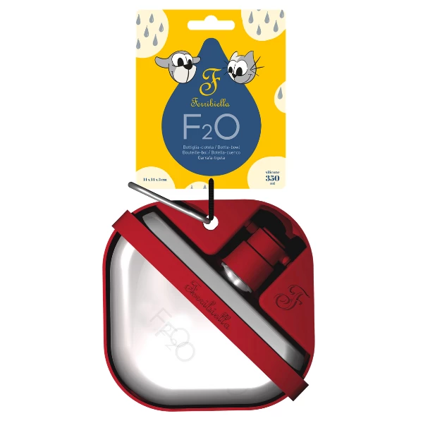 Bottiglia-Ciotola da viaggio F2O Ferribiella è innovativa, capiente e compatta, perfetta da portare insieme durante i viaggi per dissetare gli animali fuori casa.