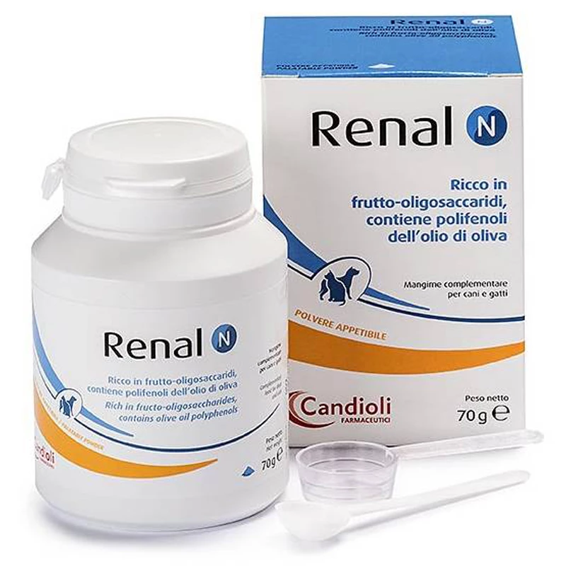 Renal N è un mangime complementare per cani e gatti indicato per il ripristino delle normali condizioni metaboliche in caso di Malattia Renale Cronica (MRC). Renal N apporta frutto-oligosaccaridi, polifenoli dell’olio di oliva, Enterococcus faecium e vitamine che favoriscono il mantenimento del normale metabolismo e di una idonea funzionalità intestinale.