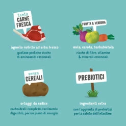 Questa ricetta senza cereali è realizzata con tanta carne fresca di agnello nutrito ad erba, ricca di proteine di alta qualità e aminoacidi essenziali. Non contiene carne essiccata, disidratata o ingredienti di scarto. Questa ricetta ipoallergenica è perfetta per cani dallo stomaco delicato e contiene prebiotici per la salute dell’intestino, oltre a un delizioso e nutriente mix di frutta, verdura ed erbe aromatiche.