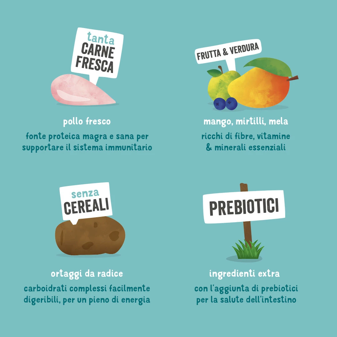 Questa ricetta senza cereali contiene tanta carne fresca di pollo allevato a terra e rappresenta un’eccellente fonte ipocalorica di proteine di alta qualità. Contiene prebiotici per la salute dell’intestino, oltre a un delizioso e nutriente mix di frutta, verdura ed erbe aromatiche. La ricetta non contiene carne essiccata, disidratata o ingredienti di scarto.