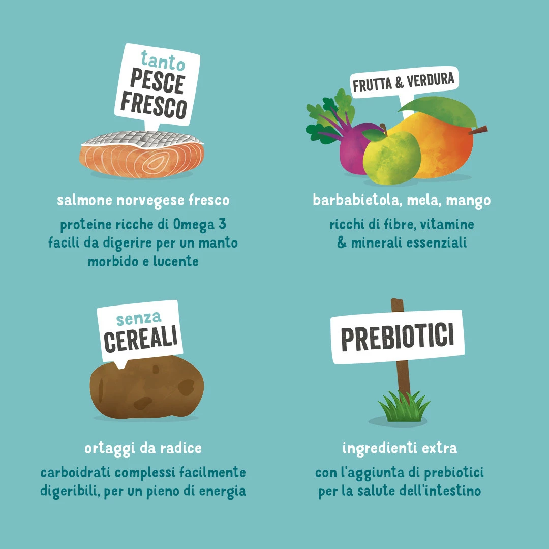 Realizzate con tanto salmone norvegese fresco, queste crocchette senza cereali sono un concentrato di proteine di alta qualità e omega 3 e non contengono in alcun modo pesce disidratato, essiccato o ingredienti di scarto. Questa ricetta ipoallergenica è perfetta per cani dallo stomaco delicato e contiene prebiotici per la salute dell’intestino, oltre a un delizioso e nutriente mix di frutta, verdura ed erbe aromatiche.