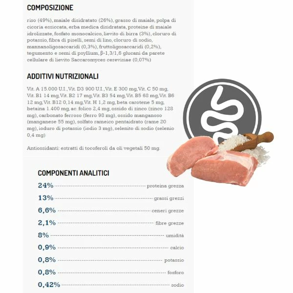 Composizione: riso (49%), maiale disidratato (26%), grasso di maiale, polpa di cicoria essiccata, erba medica disidratata, proteine di maiale idrolizzate, fosfato monocalcico, lievito di birra (3%), cloruro di potassio, fibra di piselli, semi di lino, cloruro di sodio, mannanoligosaccaridi (0,3%), fruttoligosaccaridi (0,2%), tegumento e semi di psyllium, β-1,3/1,6 glucani da parete cellulare di lievito Saccaromyces cerevisiae (0,07%)