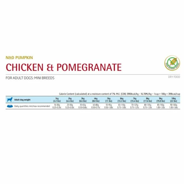 N&D Grain Free Pumpkin Adult Mini Pollo e Melograno è un alimento secco completo per cani adulti di piccola taglia. La sua formula esclusiva composta da sole carni e senza nessuna aggiunta di cereali, sostituiti da verdure e frutta fresche, permette l’apporto di nutrienti necessari all’animale, favorendo e migliorando il suo benessere e la sua salute.