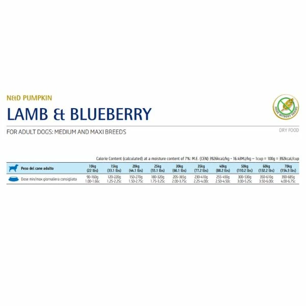 Farmina N&D Grain Free Pumpkin Puppy Medium/Maxi Agnello e Mirtillo è l’alimento secco completo per cani cuccioli di taglia media e grande e per cagne in gestazione o in allattamento.