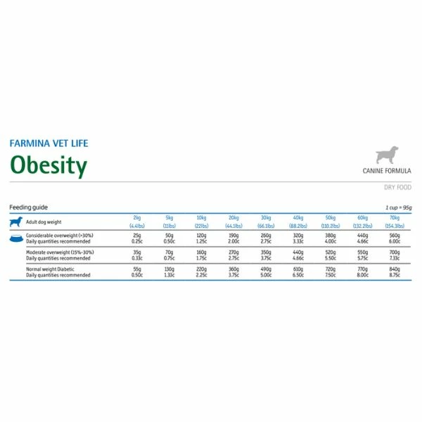 Farmina Vet Life Canine Obesity è un alimento dietetico completo per cani, appositamente formulato per la riduzione dell’eccesso di peso corporeo e il controllo dell’apporto di glucosio (diabete mellito).