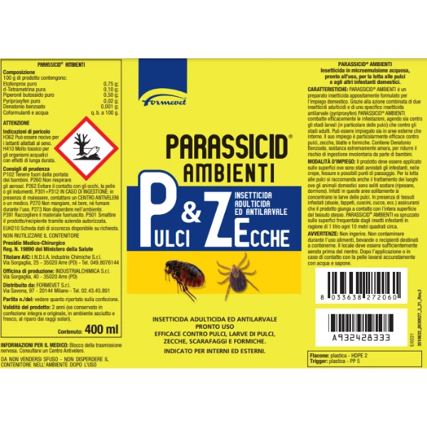 Formevet Parassicid ambientiè l’insetticida, pronto all’uso, per la lotta alle pulci.