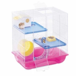 Imac Gabbia Criceti è una gabbia per criceti con un habitat sviluppato su tre livelli collegati da tubi colorati trasparenti per garantire il massimo del divertimento ai tuoi piccoli amici. E’ caratterizzata da un robusto fondo in plastica semitrasparente e una struttura in rete metallica verniciata bianca.