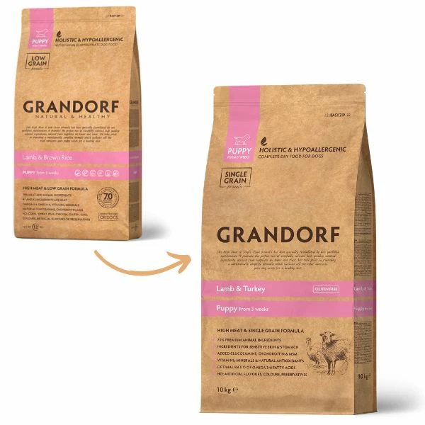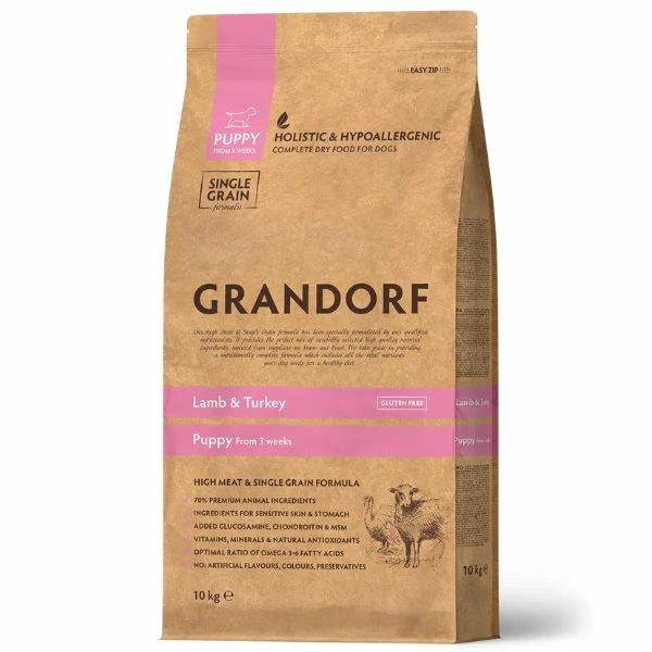 Grandorf Dog Puppy All Breeds Hypoallergenic Agnello e Tacchino è l’alimento ideale per il delicato sistema digestivo dei cuccioli oltre i tre mesi di vita. Un alto contenuto di proteine essenziali, grassi sani, aminoacidi e vitamine garantisce una crescita e uno sviluppo sano dei cuccioli.