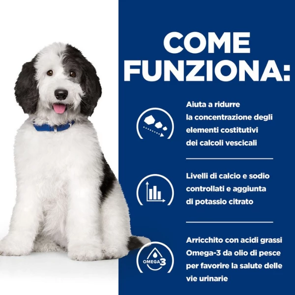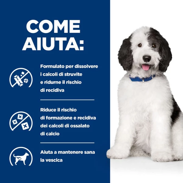 Informazioni aggiuntive: I calcoli alla vescica sono accumuli di cristalli minerali che si combinano nel tratto urinario. Possono causare disagio e portare problemi più seri che richiedono le cure di un veterinario. I nutrizionisti e veterinari di Hill’s hanno sviluppato Prescription Diet c/d Multicare nutrizione clinica appositamente formulata per supportare la salute urinaria del cane e ridurre il rischio di calcoli di struvite e ossalato di calcio. Questo alimento secco è fatto con pollo e ha un gusto irresistibile che il tuo cane adorerà .