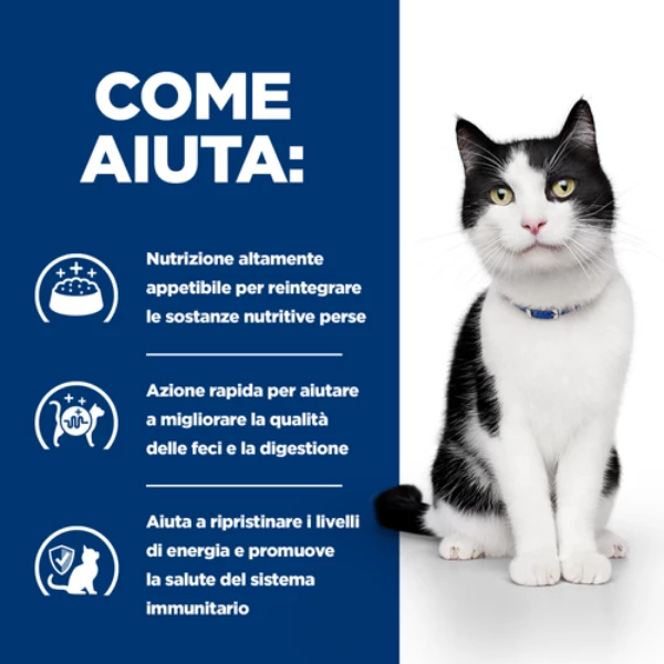 Hill’s Prescription Diet i/d Alimento per Gatti è un alimento altamente digeribile formulato appositamente per aiutare a ridurre i disturbi gastrointestinali e garantire un facile assorbimento dei nutrienti. È arricchito con elettoliti e vitamine del gruppo B che aiutano a sostituire i nutrienti persi. Realizzato con la tecnologia esclusiva di Hill’s ActivBiome+, una speciale miscela di fibre prebiotiche, clinicamente dimostrata per nutrire rapidamente il microbioma intestinale, per supportare la qualità ottimale delle feci e la salute dell’apparato digerente. Arricchito con Omega-3 e Omega-6 e antiossidanti clinicamente testati per aiutare a sostenere un sistema immunitario sano.