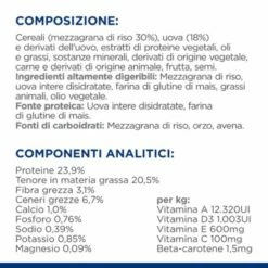 COMPOSIZIONE: Cereali (mezzagrana di riso 30%), uova (18%) e derivati dell’uovo, estratti proteici vegetali, olio e grassi, minerali, derivati di origine vegetale, carne e derivati di origine animale, frutta, semi.
