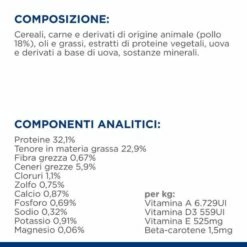 COMPOSIZIONE: Cereali, carne e derivati di origine animale (pollo 18%), oli e grassi, estratti di proteine vegetali, uova e derivati a base di uova, sostanze minerali.
