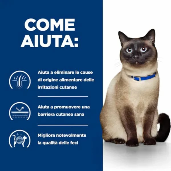 Le sensibilità e le intolleranze alimentari sono problemi potenzialmente gravi che possono provocare irritazioni della pelle, del pelo e delle orecchie o persino disturbi gastrointestinali. I gatti che hanno una sensibilità o intolleranza alimentare, chiamate anche reazioni avverse al cibo, in genere sperimentano una risposta anormale alla proteina nel cibo. Se il tuo gatto soffre di una reazione avversa al cibo, è ancora più importante somministrare il giusto alimento. I nutrizionisti e i veterinari di Hill’s hanno sviluppato la nutrizione clinica Prescription Diet z / d appositamente formulata per ridurre i segni cutanei e gastrointestinali causati dalle intolleranze alimentari. Difatti z/d è un alimento clinicamente testato per aiutare a evitare reazioni avverse al cibo.