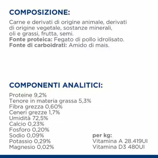 COMPONENTI ANALITICI: Proteine 9,2%, Tenore in materia grassa 5,3%, Fibra grezza 0,60%, Ceneri grezze 1,7%, Umidità 72,5%, Calcio 0,23%, Fosforo 0,20%, Sodio 0,09%, Potassio 0,29%, Magnesio 0,02%; per kg: Vitamina A 28.419UI, Vitamina D3 480UI.