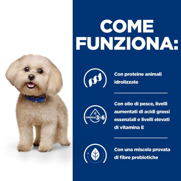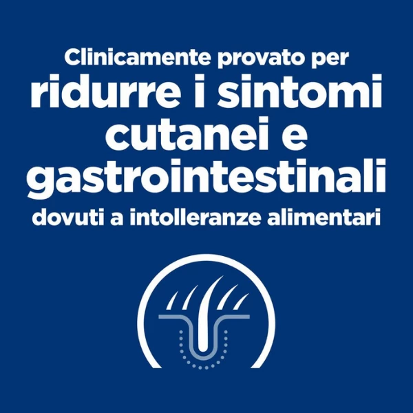 Hill’s Prescription Diet z/d mini Canine è un alimento dietetico completo ideale per cani di taglia piccola adulti/anziani, con particolari intolleranze alimentari. Questo alimento dietetico Hill’s Prescription Diet contiene una fonte selezionata di carboidrati e una fonte di proteine idrolisate. Nutrizione clinicamente testata per ridurre i segni cutanei e gastrointestinali causati dalle intolleranze alimentari. Le sensibilità e le intolleranze alimentari sono problemi potenzialmente gravi che possono provocare irritazioni della pelle, del pelo e delle orecchie o persino disturbi gastrointestinali. I cani che hanno reazioni avverse al cibo dovute a un’allergia alimentare (tipicamente a una proteina nel cibo) o un’intolleranza traggono beneficio da un alimento progettato per le sensibilità alimentari.