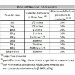 Esempio: un cane di 15kg. Se alimentato esclusivamente con crocchette (con contenuto energetico medio di 3.600 kcal/kg), deve assumere al giorno ca. 280g di crocchette. Se si aggiunge 1 lattina di Mixer Crocc, la dose di crocchette va ridotta del 10%, quindi 28g. Quindi: Solo secco: 280g crocchette, Crocchette+Mixer Crocc: 252g di crocchette + 1 lattina di Mixer Crocc