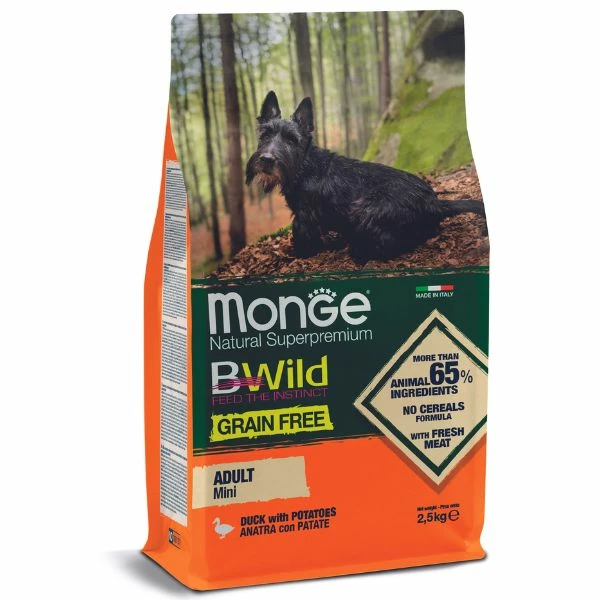 Monge Natural Superpremium BWild Grain Free Formula Mini Cane Adulto Anatra con patate è un alimento completo e bilanciato per cani adulti. Formulato per il benessere dei tuoi cani di piccola taglia, grazie alla selezione di fonti alternative di carboidrati non derivati dai cereali, come le patate.