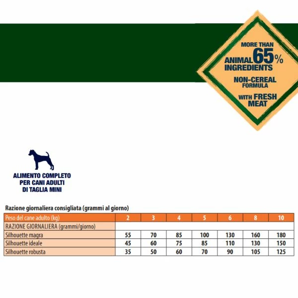 Istruzioni per l’uso: La razione giornaliera raccomandata indicata in tabella (vedi grafica in gallery) può essere suddivisa in 2 pasti giornalieri. Le quantità possono essere adattate a seconda della taglia, età e attività fisica dell’animale. Lasciare sempre a disposizione acqua fresca e pulita. Quando il prodotto va a sostituire un altro tipo di mangime e/o tipo di alimentazione si consiglia di introdurlo gradualmente, in almeno 1 settimana di tempo. Alimento per cani non utilizzabile per alimentazione umana.