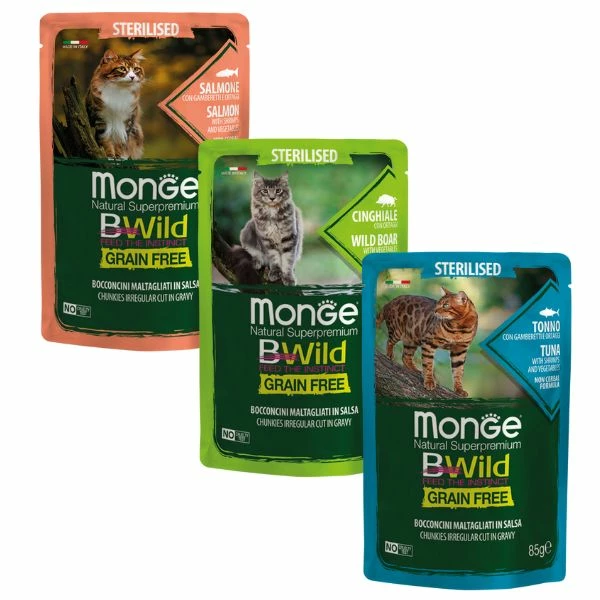 Monge BWild Grain Free Sterilised Cat 85 gr è l’alimento umido completo e bilanciato, per gatti adulti sterilizzati. Ogni ricetta è preparata rispondendo alle specifiche esigenze che il micio sterilizzato presenta. Scoprile tutte, da leccarsi i baffi!