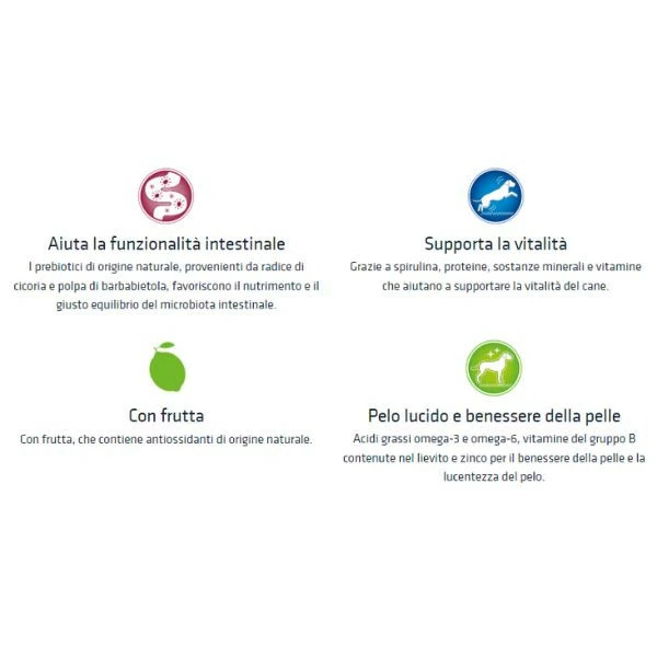 - Supporta la vitalità. Grazie a spirulina, proteine, sostanze minerali e vitamine che aiutano a supportare la vitalità del cane