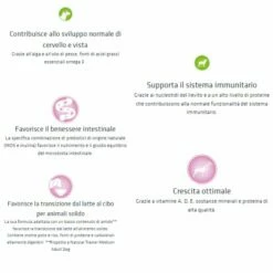- Crescita ottimale. Grazie a vitamine A, D, E, sostanze minerali e proteina di alta qualità.