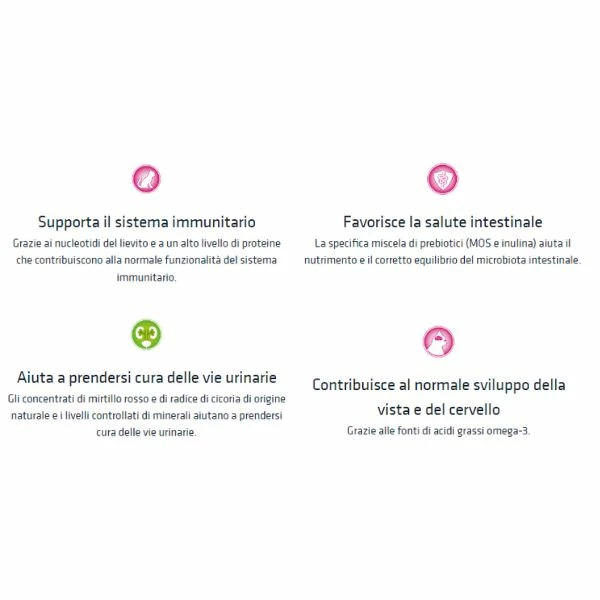 - Favorisce la salute intestinale. La specifica miscela di prebiotici (MOS e inulina) aiuta il nutrimento e il corretto equilibrio del microbiota intestinale.