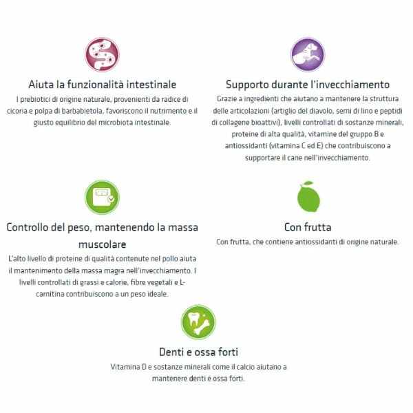 - Supporto durante l’invecchiamento. Grazie a ingredienti che aiutano a mantenere la struttura delle articolazioni (artiglio del diavolo, semi di lino e peptidi di collagene bioattivi), livelli controllati di sostanze minerali, proteine di alta qualità, vitamine del gruppo B e antiossidanti (vitamina C ed E) che contribuiscono a supportare il cane nell’invecchiamento.