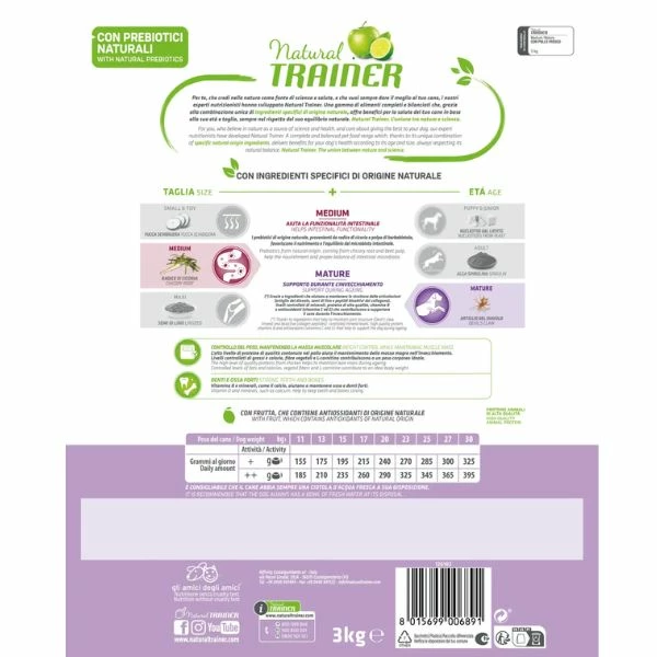 Natural Trainer Maturity Medium 7+ con Pollo Fresco è un alimento secco completo per cani maturi (oltre 7 anni di età) di taglia media (10- 30 kg). Per preservare lo stato di salute del cane di taglia media con più di 7 anni è necessario avvalersi di un nutrimento funzionale e ricco di sostanze naturali.