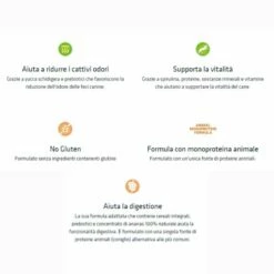 Composizione: coniglio 13% , granturco integrale 12% , proteina di granturco , fioretto di granturco , piselli disidratati , proteine disidratate di coniglio 8,5% , grasso di origine animale , farinaccio di riso, ceci disidratati , riso integrale 4% , semi di lino* , aroma senza proteine animali , sostanze mineali , olio di granturco , concentrato secco di radice di cicoria (fonte di inulina)* 0,8% , concentrato secco di gambo di ananas* 0,1% , spirulina 0,1% , Yucca schidigera essiccata* 0,025% , *Ingredienti specifici di origine naturale