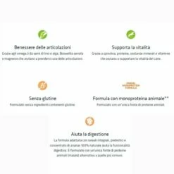 Il suo complesso nutrizionale favorisce il benessere dell’animale e garantisce il giusto apporto energetico. Grazie alle proteine della carne di maiale utilizzate, questo alimento è ideale per cani predisposti alle sensibilità alimentari, poiché monoproteico. Consente di migliorare la funzionalità digestiva, regolarizzando anche il transito intestinale grazie al pisello verde, unico carboidrato presente.