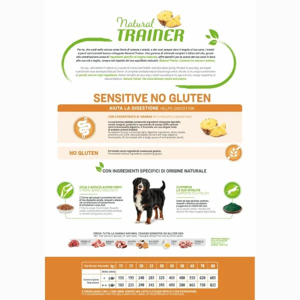 La linea Trainer Natural è stata pensata per far fronte al fabbisogno energetico dell’animale. Queste crocchette, ricche di proteine e carboidrati, sono molto utili per ridurre la possibilità di spiacevoli odori, mentre gli antiossidanti apportano molti benefici all’organismo dei nostri amici a quattro zampe. Inoltre, permettono di preservare la salute e l’efficienza articolare attraverso i principi naturali dei cereali integrali Inizialmente, introdurre le crocchette Natural Trainer Sensitive No Gluten in modo graduale. Le quantità consigliate sono orientative e devono essere adattate alle condizioni fisiche, al livello di attività e alle condizioni climatiche. Si consiglia un esercizio quotidiano per mantenere il cane in condizioni fisiche ottimali.