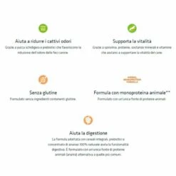 - Aiuta la digestione. La formula adattata con cereali integrali, prebiotici e concentrato di ananas 100% naturale aiuta la funzionalità digestiva. È formulato con un’unica fonte di proteine animali (anatra) alternativa a quelle più comuni.