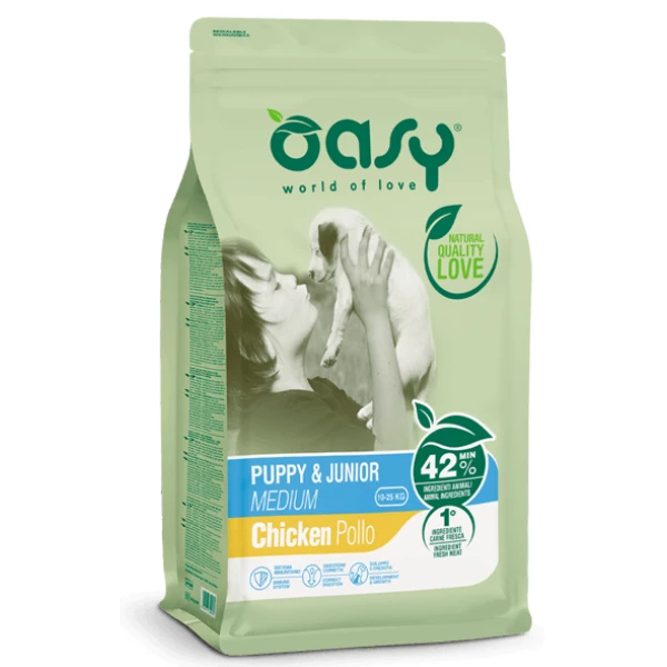 Oasy Dog Puppy Junior Medium è un alimento secco completo per cuccioli di taglia media da 1 a 18 mesi. La sua formula esclusiva è stata ideata per il giusto mantenimento del fabbisogno energetico del vostro amico a quattro zampe. Gli ingredienti di alta qualità utilizzati, favoriscono un alta digeribilità dell’alimento. L’apporto bilanciato di acidi grassi Omega 6 e 3 favorisce una pelle sana e un mantello folto e brillante.