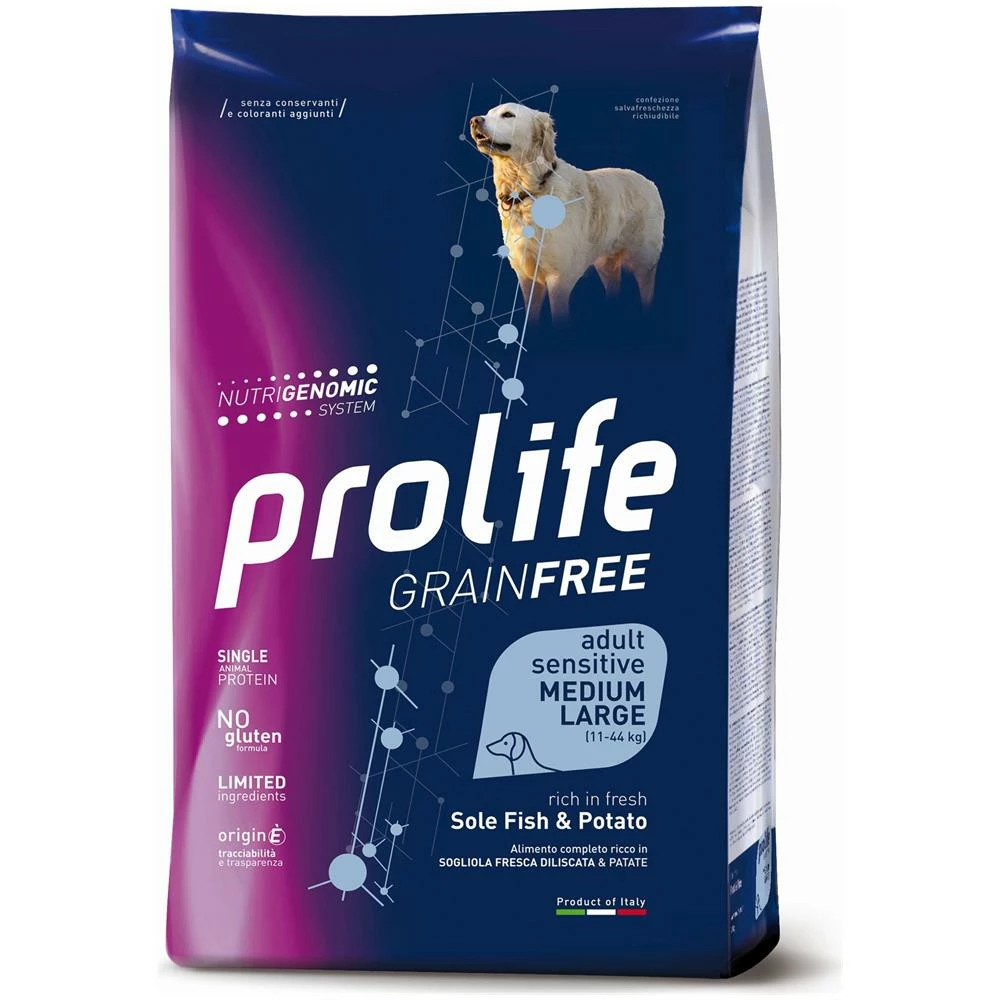 Prolife Grain Free Adult Sensitive Medium/Large Sogliola e Patate è un alimento completo ricco di carne fresca di sogliola e patate per il cane adulto ipersensibile formulato per le specifiche esigenze del cane adulto di taglia media e grande che presenta sensibilità digestive, articolari o cutanee. Le cause delle sensibilità possono essere molteplici: regime alimentare instabile, variazioni improvvise del ritmo di vita, sforzi prolungati e intensi, inquinamento atmosferico, scarsa qualità dell’alimentazione. L’inclusione di Sogliola e della Patata, materie prime di elevata qualità, rende l’alimento leggero e appetibile, particolarmente adatto a questa tipologia di cani.