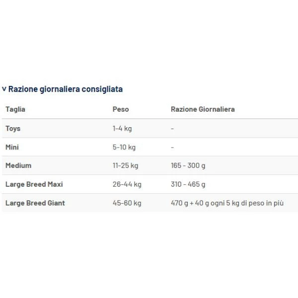 | Taglia del cane | Peso | Razione giornaliera |