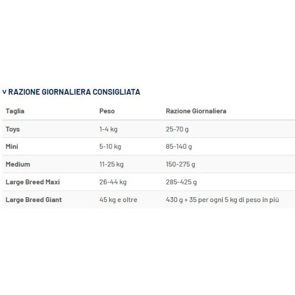 | Giant | +45 kg | 430 gr + 35 per ogni 5 kg di peso in più |