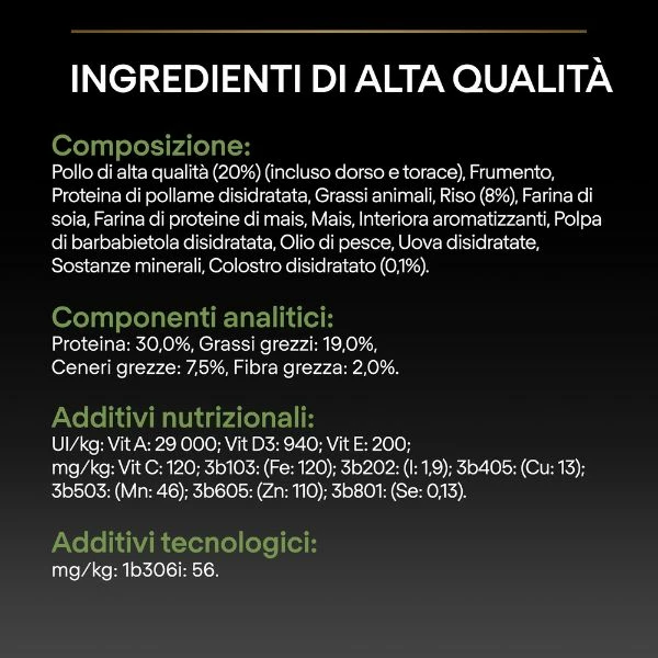Composizione: Pollo di alta qualità (20%) (incluso dorso e torace), Frumento, Proteina di pollame disidratata, Grassi animali, Riso (8%), Farina di soia, Farina di proteine di mais, Mais, Interiora aromatizzanti, Polpa di barbabietola disidratata, Olio di pesce, Uova disidratate, Sostanze minerali, Colostro disidratato (0,1%).