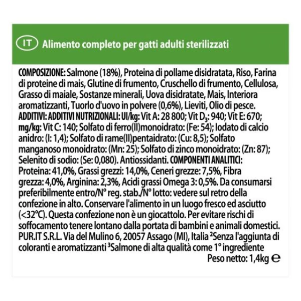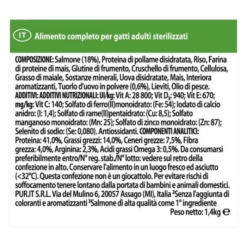 - La particolare formula aiuta a mantenere in salute il tratto urinario nei gatti sterilizzati grazie ad una dose bilanciata di minerali;