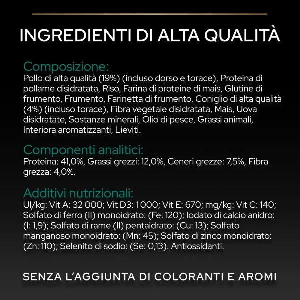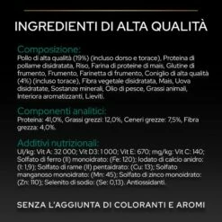 COMPOSIZIONE: Pollo di alta qualità (19,0%) (incluso dorso e torace), Proteina di pollame disidratata, Riso, Farina di proteine di mais, Glutine di frumento, Frumento, Farinetta di frumento, Coniglio di alta qualità (4,0%) (incluso torace), Fibra vegetale disidratata, Mais, Uova disidratate, Sostanze minerali, Olio di pesce, Grassi animali, Interiora aromatizzanti, Lieviti