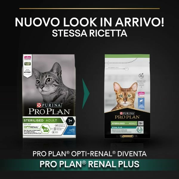 Purina Pro Plan Renal Plus Sterilised Adult 1+ con Coniglio è l’alimento secco completo per gatti adulti sterilizzati, formulato per promuovere una sana funzione renale nel gatto.