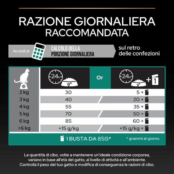 Peso del Gatto Quantità Crocchette Quantità Crocchette + 1 busta umido 85g