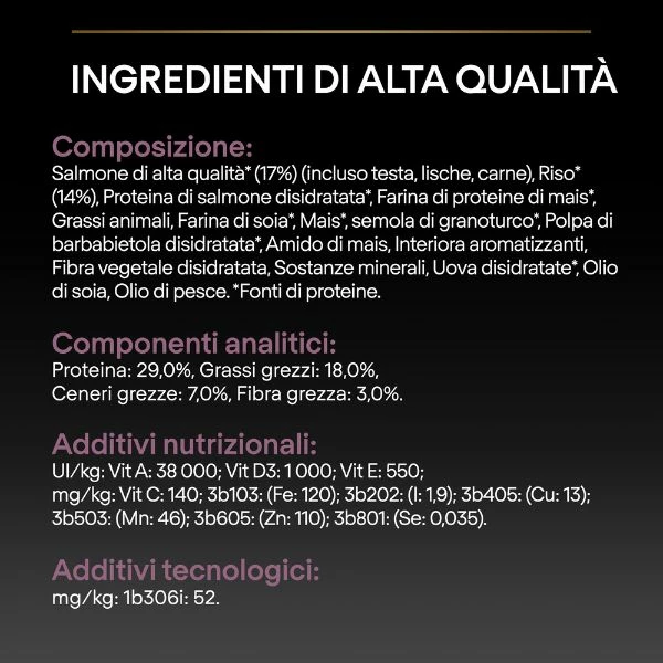 Composizione: Salmone di alta qualità * (17%) (incluso testa, lische, carne), Riso* (14%), Proteina di salmone disidratata*, Farina di proteine di mais*, Grassi animali, Farina di soia*, Mais*, semola di granoturco*, Polpa di barbabietola disidratata*, Amido di mais, Interiora aromatizzanti, Fibra vegetale disidratata, Sostanze minerali, Uova disidratate*, Olio di soia, Olio di pesce. *Fonti di proteine