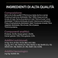 Additivi nutrizionali: Salmone di alta qualità * (17%) (incluso testa, lische e carne), Proteina di salmone disidratata*, Riso* (16%), Grassi animali, Amido di mais, Farina di proteine di mais*, Farina di soia*, Uova disidratate*, Proteine idrolizzate di soia*, Interiora aromatizzanti, Polpa di barbabietola disidratata*, Mais*, Sostanze minerali, Fibra vegetale disidratata, Olio di soia, Olio di pesce. *Fonti di proteine