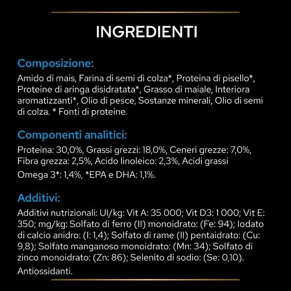 Composizione: Amido di mais, Farina di semi di colza*, Proteina di pisello*, Proteine di aringa disidratata*, Grasso di maiale, Interiora aromatizzanti*, Olio di pesce, Sostanze minerali, Olio di semi di colza. * Fonti di proteine.